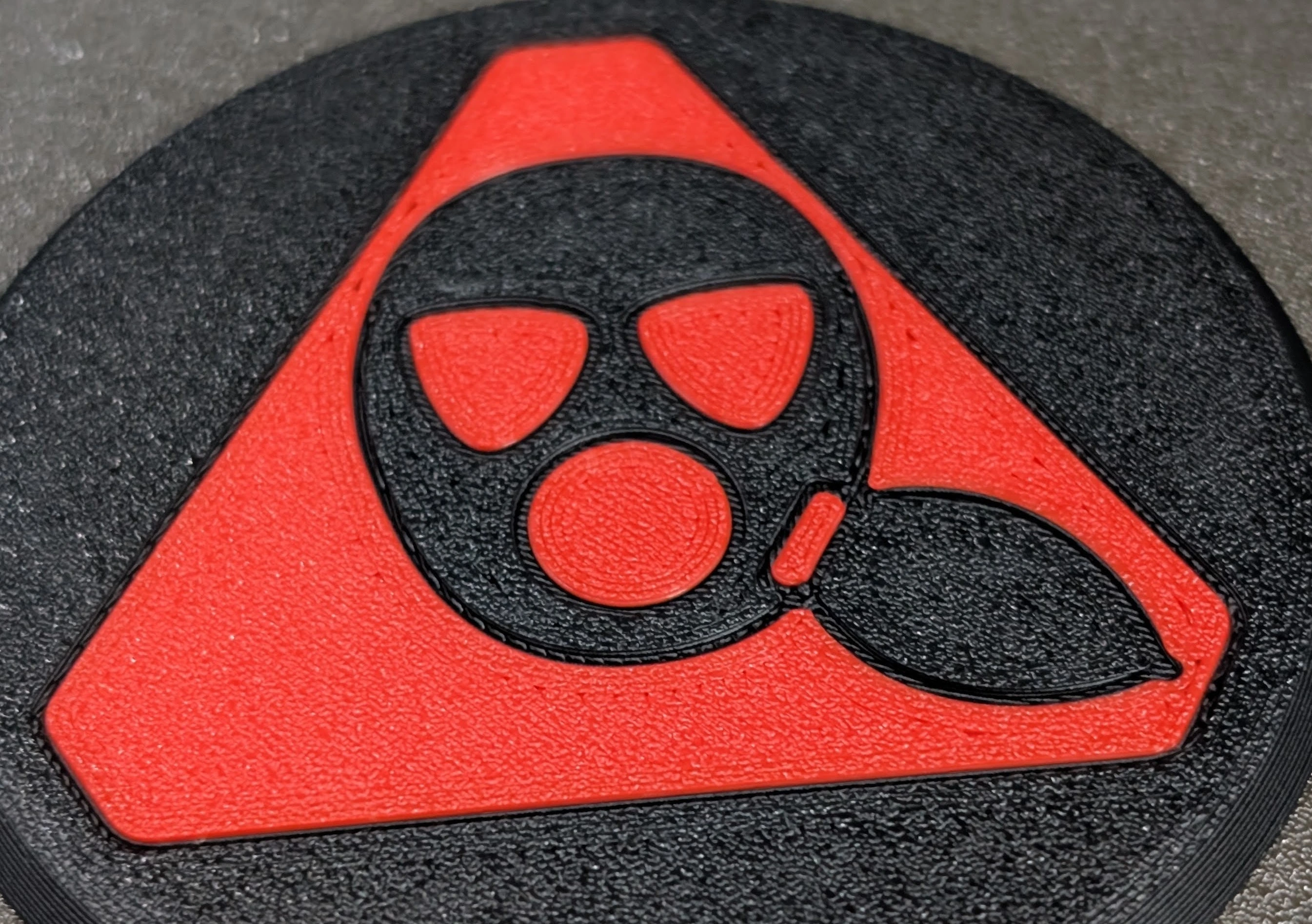 Vícebarevný tisk realizovaný na tiskárně Original Prusa MK4 s jednotkou MMU3. Použity materiály Spectrum PLA MATT a Filamentree PLA Plus Traffic Red. Díky použití zrnitého platů je povrch hrubý.