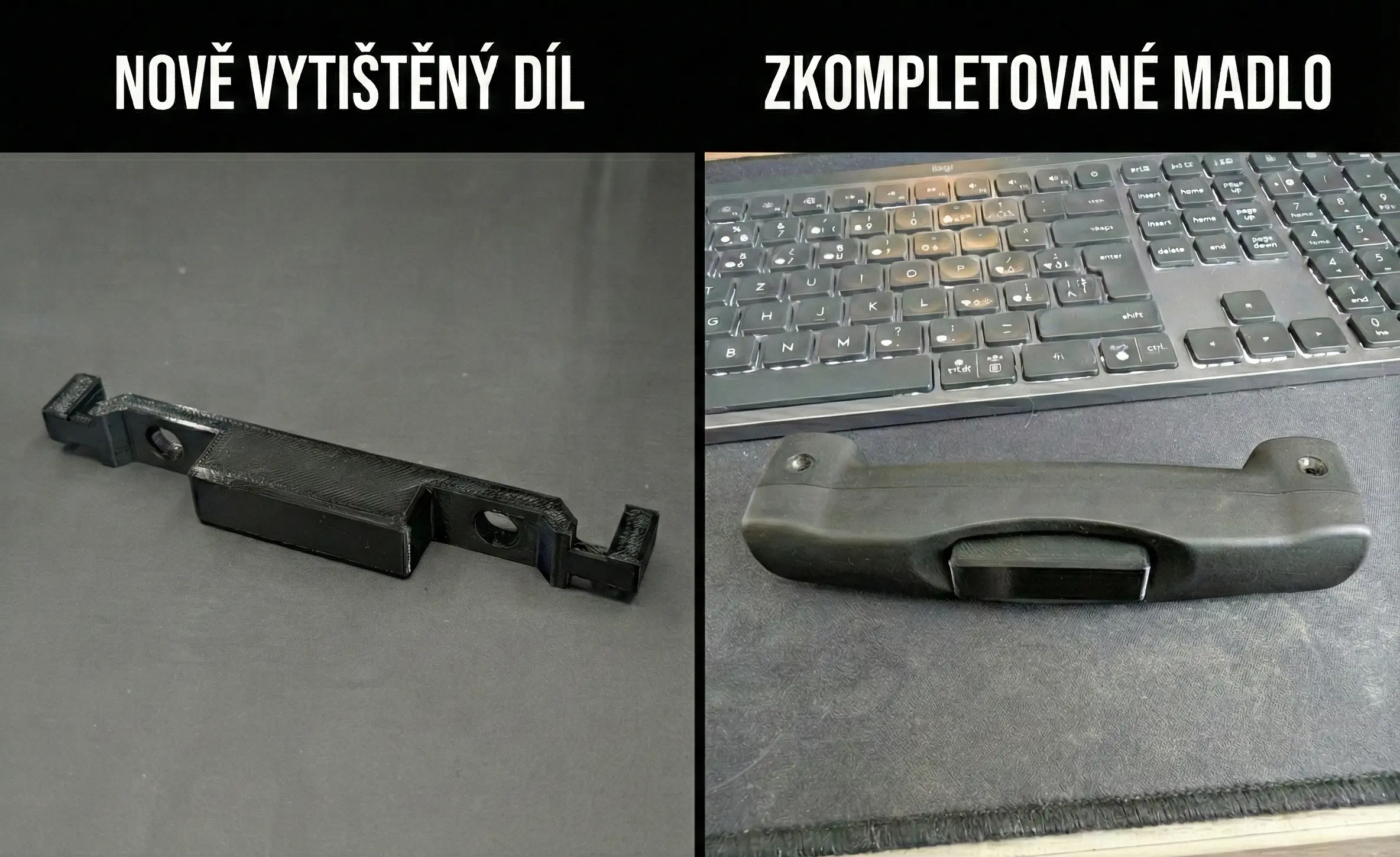 Oprava zlomené aretace madla u drahého cestovního kufru. Díl byl vymodelován dle zbytků původního a vytištěn z PETG s vysokou výplní.